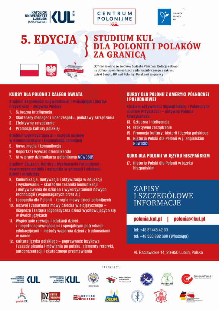 Katolicki Uniwersytet Lubelski zaprasza osoby pełnoletnie, chcące podnieść swoje kompetencje i zdobyć nową wiedzę, do udziału w Studium KUL dla Polonii i Polaków za granicą. Oferta Studium jest szeroka i obejmuje aż 14 różnych kursów dotyczących m.in. sztucznej inteligencji, efektywnego zarządzania, promocji kultury polskiej, nowych mediów i komunikacji, historii Polski dla Polonii, teologii i nowej ewangelizacji, poradnictwa i strategii wspierających oraz kurs wsparcia rodzin i osób w kryzysie.
